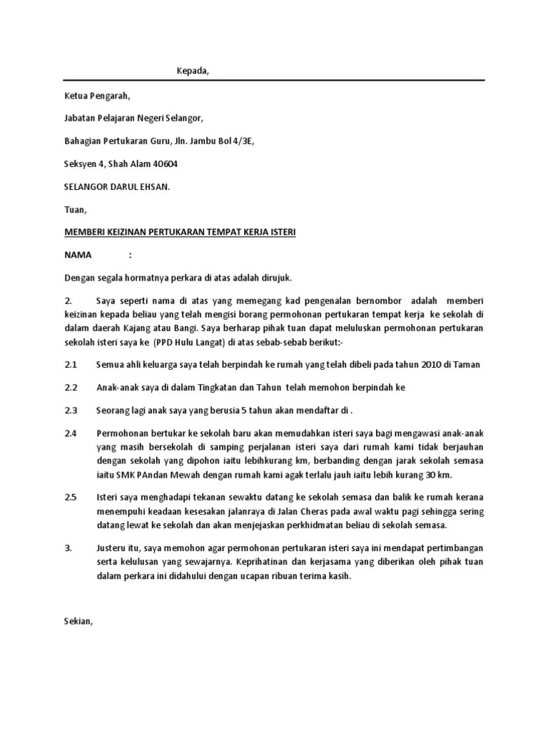 Contoh Surat Permohonan Pertukaran Tempat Kerja Mengikut Suami - Contoh Surat Rayuan Pertukaran Guru Ikut Suami Adinasinc Otosection. Surat pekeliling itu, antara lain, memperuntukkan: Portal rasmi jabatan perkhidmatan awam jpa. (ii) pegawai b, waktu masuk pada pukul 7.50 pagi dan waktu pulang pada pukul 4.50 petang; Rawatan di institut jantung negara sdn. Terdapat arahan kerja lebih masa kepada 4 orang pegawai kumpulan pelaksana di putrajaya yang waktu masuk dan waktu pulang mereka adalah berbeza seperti berikut: Walau bagaimanapun, bagi tujuan mengemaskini maklumat peribadi yang lain, tuan dikehendaki untuk mengemukakan satu surat pemberitahuan beserta. (i) pegawai a, waktu masuk pada pukul 7.20 pagi dan waktu pulang pada pukul 4.30 petang; 8.8.2022 majlis pelancaran sambutan bulan kemerdekaan peringkat jpa